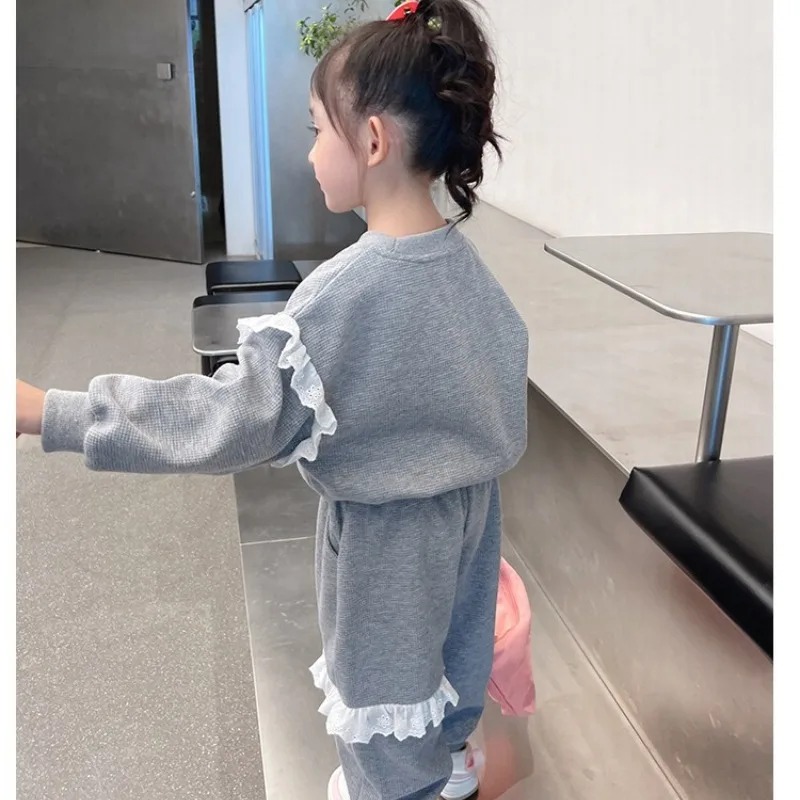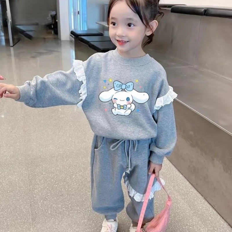 طقم خريفي للفتيات 2 قطعة مكون من بلوزة مطبوعة وسروال، مزين بدانتيل أنيق ورسومات سانريو سينامورول الشهيرة. تصميم مريح وعملي للأطفال، مناسب للارتداء اليومي والخروج، يمنح الطفلة إطلالة لطيفة وأنيقة في الخريف.
