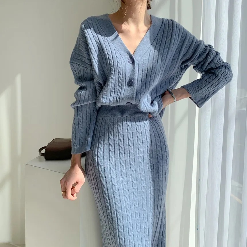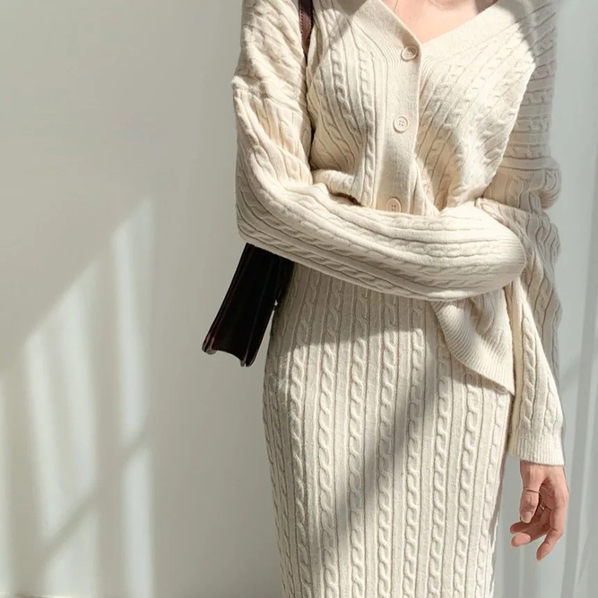 طقم نسائي محبوك مكوّن من كارديجان وتنورة